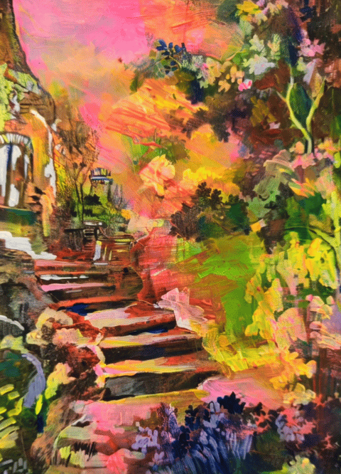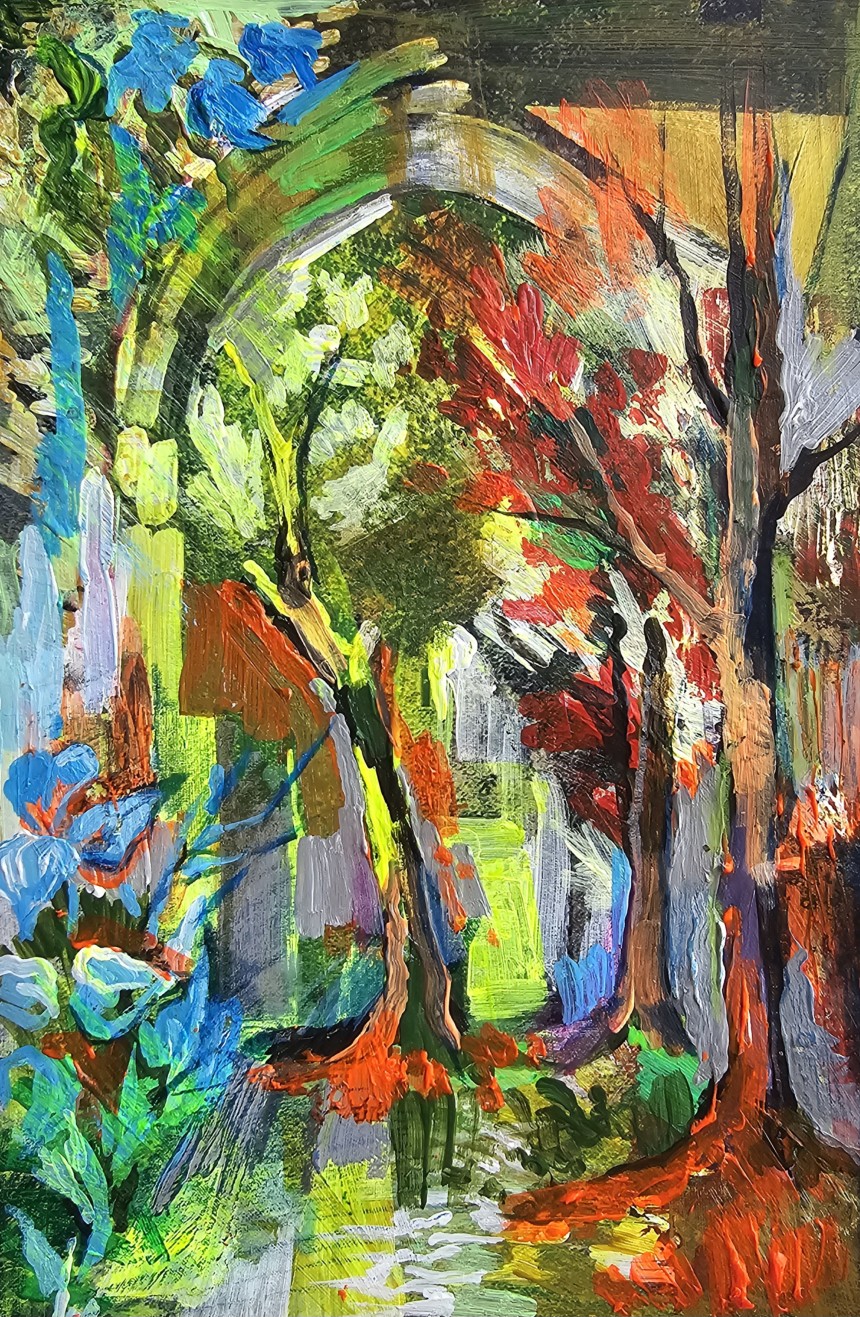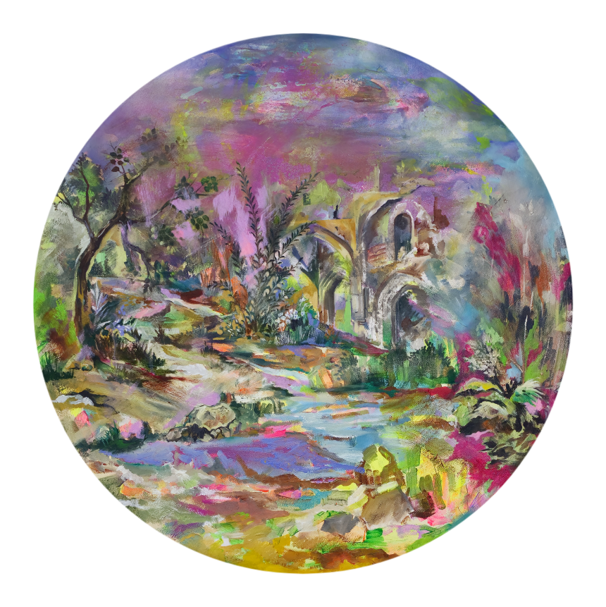 (Circular Canvas, 70 cm, Oil on Canvas, 2023) In this landscape of imagination, colors flow like a dream upon the canvas; the ruins speak...
